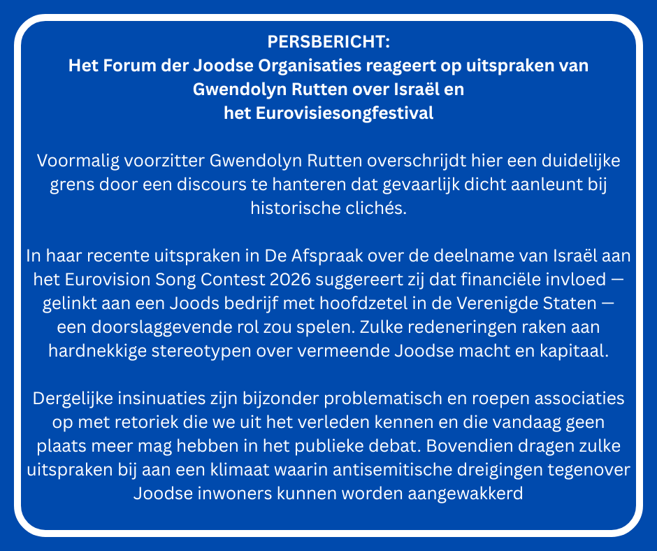 Het Forum der Joodse Organisaties veroordeelt met klem de toekenning van een eredoctoraat aan Francesca Albanese. Het eren van iemand met langdurig en gedocumenteerd controversiële uitlatingen is volledig onaanvaardbaar. Haar […]